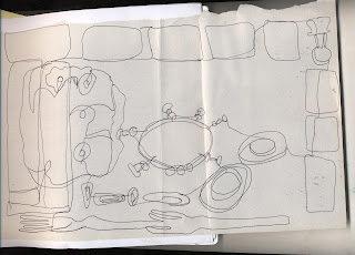 Also from before Christmas- our brief was to make a story in any form we liked- I've used coloured pencils, and I liked them a lot. You'll see I use them often afterwards. This is the story of a wooden bird living alone on a small blue planet with a giant tree. The bird eats stars and then cries out star atoms on the tree, so it gets food too. But the stars run out, and the tree dies, and the bird jumps onto the Earth. where it finds out humans smell like the stars- apparently we're made up of star atoms- and because it is very hungry, the bird begins to eat humans.